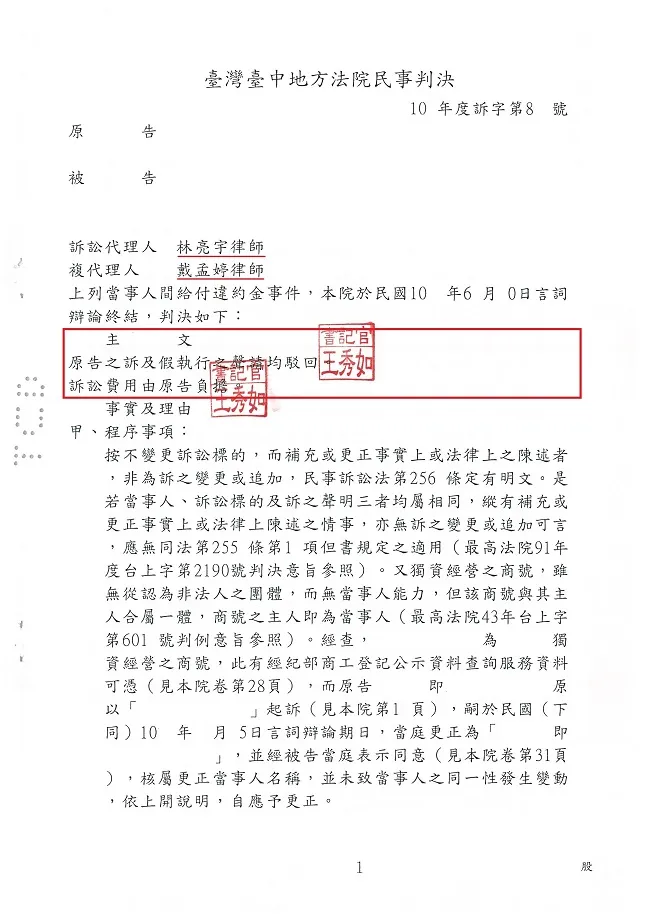 商品已完成建築物維修工程,業主因經營權異動竟然拒絕給付,經委任真亮法律事務所,爭取【合理】金額,判決【確定】。