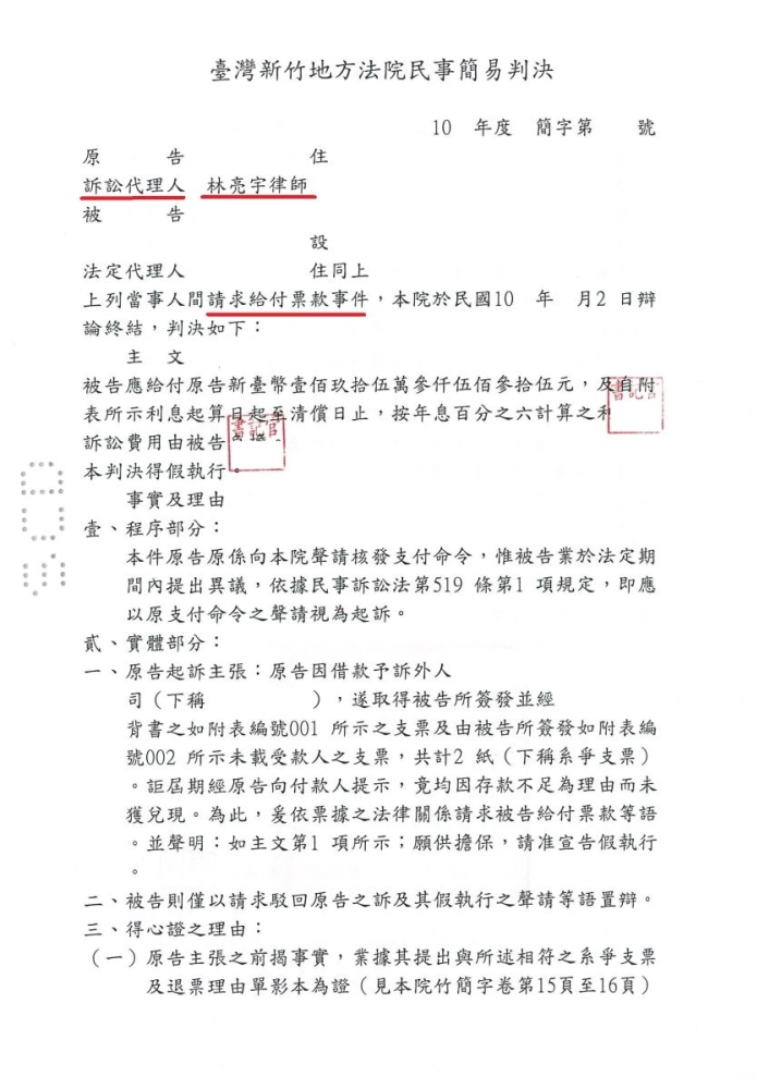 近期真亮法律事務所承辦一個借款案件,債務人拿著其他發票人簽發的支票,背書交付給當事人清償,但該還錢的時間到了都沒有還錢(清償),支票也跳票,債權人尋求真亮法律事務所所長林亮宇律師協助,經林亮宇律師分析,建議可先同步主張,一方面對債務人主張債權,一方面向法院對發票人聲請發【支付命令】,一方面省時也較節省裁判費,如果發票人不異議,就可以聲請強制執行。但因發票人在20日內聲明異議,當事人無奈之下只能提出訴訟,訴訟中發票人承認票據為真實,抗辯債務人也積欠其金錢,導致無法清償等。經林亮宇律師主張被告之抗辯完全無理由,臺灣新竹地方法院認同我方主張,認為發票人支主張無理由,判決我方【勝訴】確定。案件確定後可以聲請強制執行,後續定時向法院聲請執行就不會超過時效。