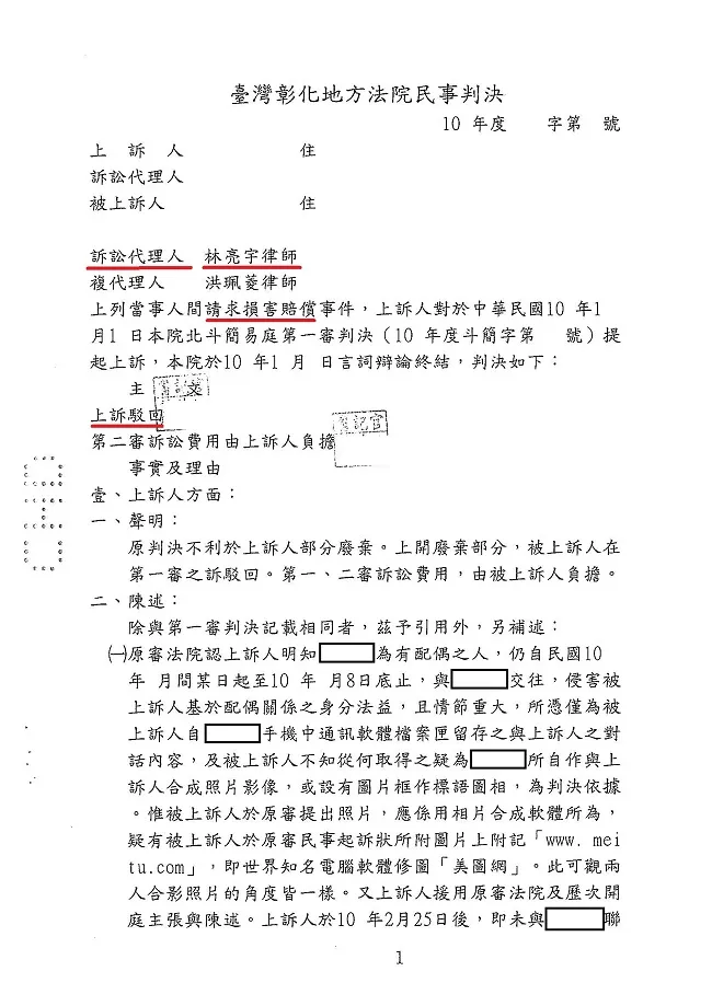 商品已婚女子與配偶以外男子共居同遊,侵害配偶法益【婚外情】,先生起訴要求連帶賠償,經真亮法律事務所辦理【勝訴】確定