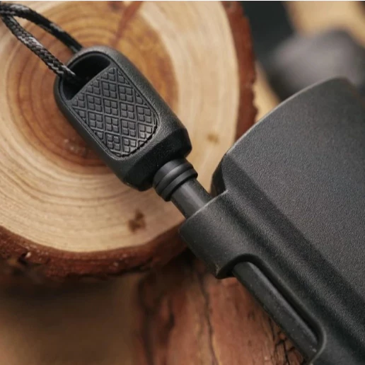 🔥求生配件附有打火棒、側邊簡易磨刀器與反光傘繩。