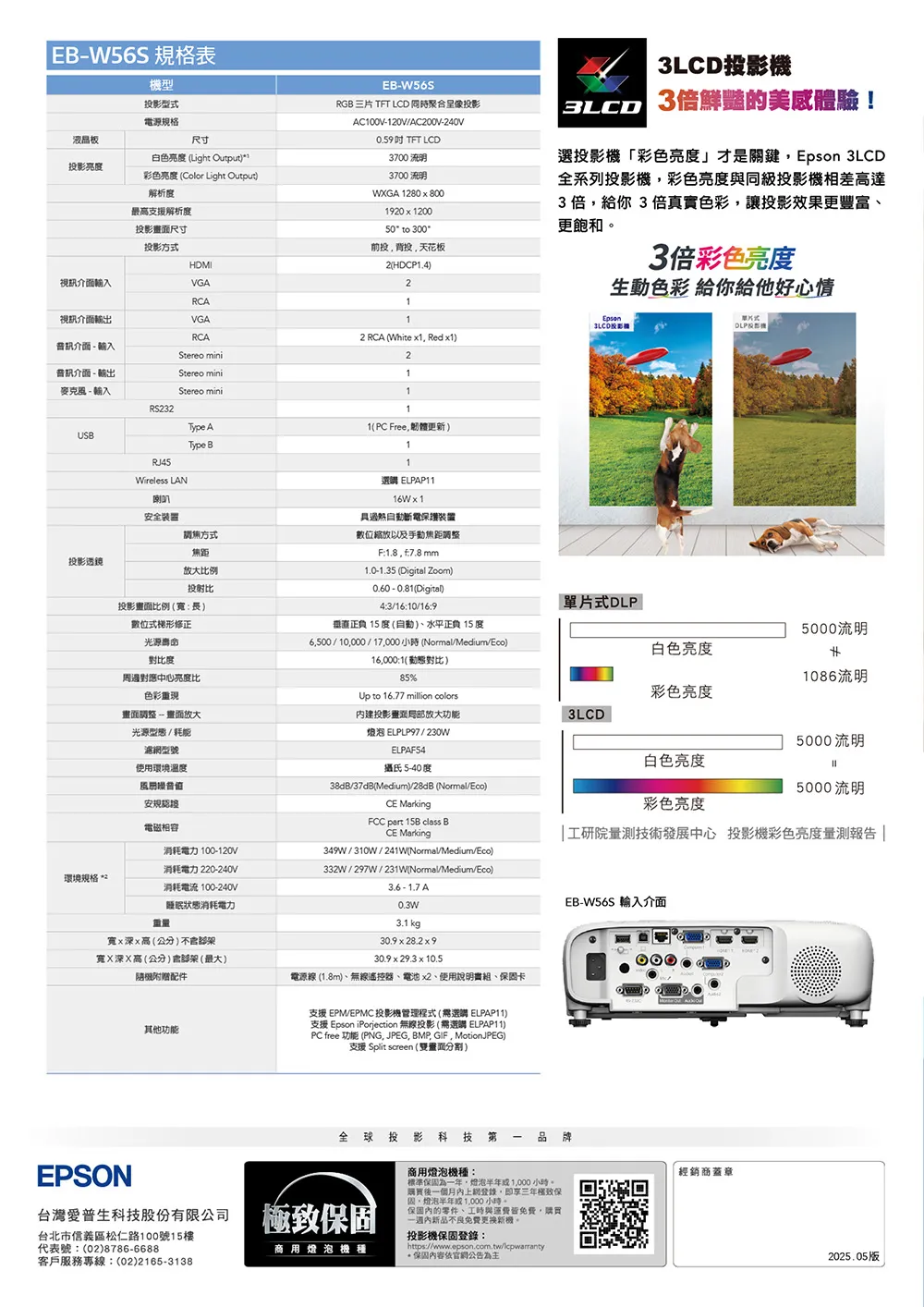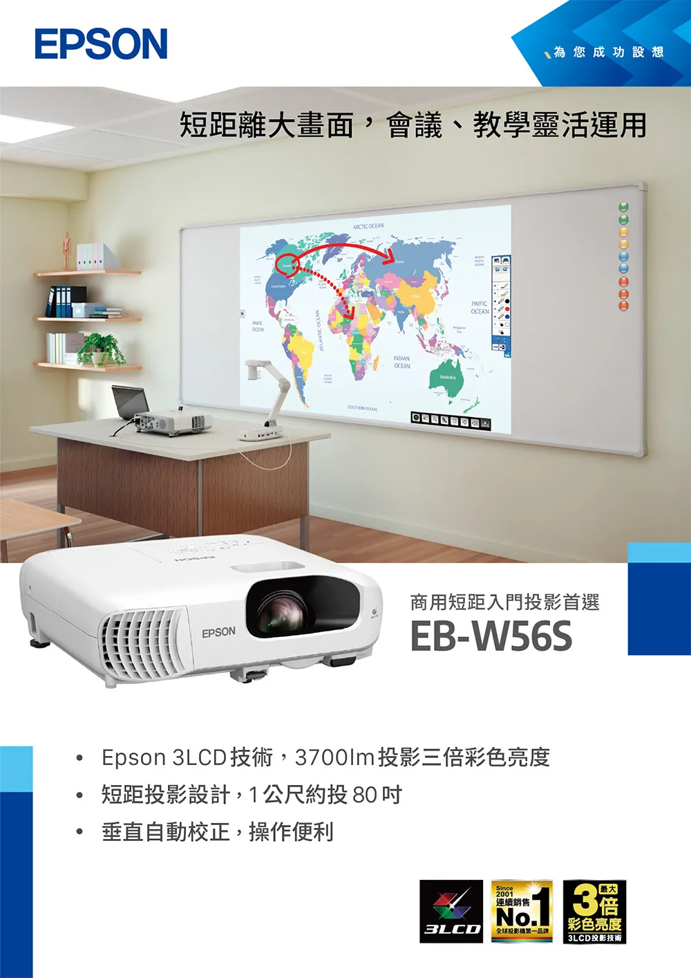 挑選投影機除了注意白色亮度(根據全白區塊所測量的亮度)是否符合標準,例如使用ANSI或是ISO之外,更需要注意是否標註彩色亮度。全新Epson EB-W56S商用短焦投影機,採用3LCD投影技術,「白色亮度」及「彩色亮度」都達到3700流明,不必犧牲環境光源,看得更舒適