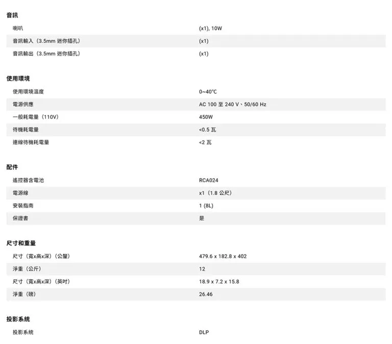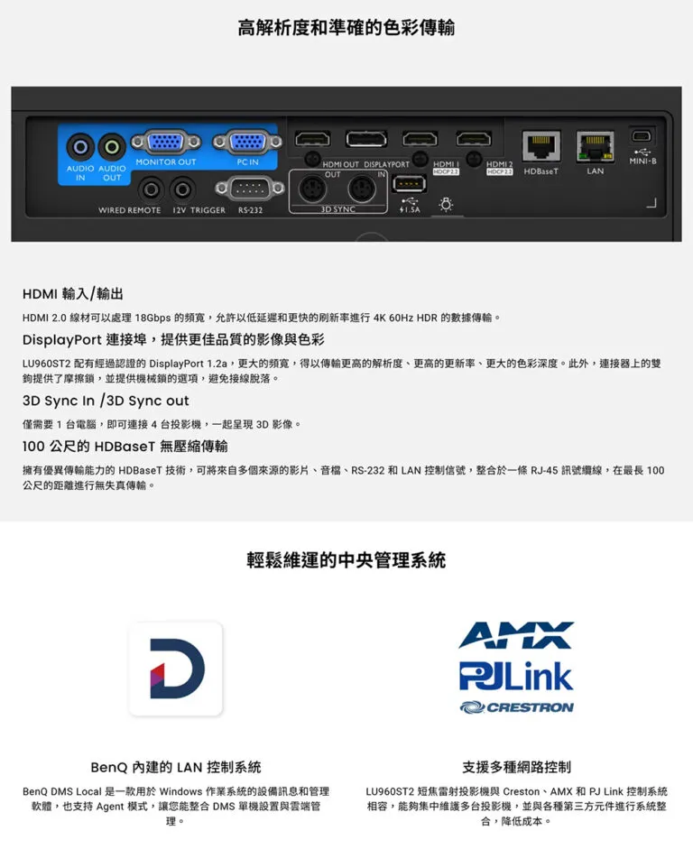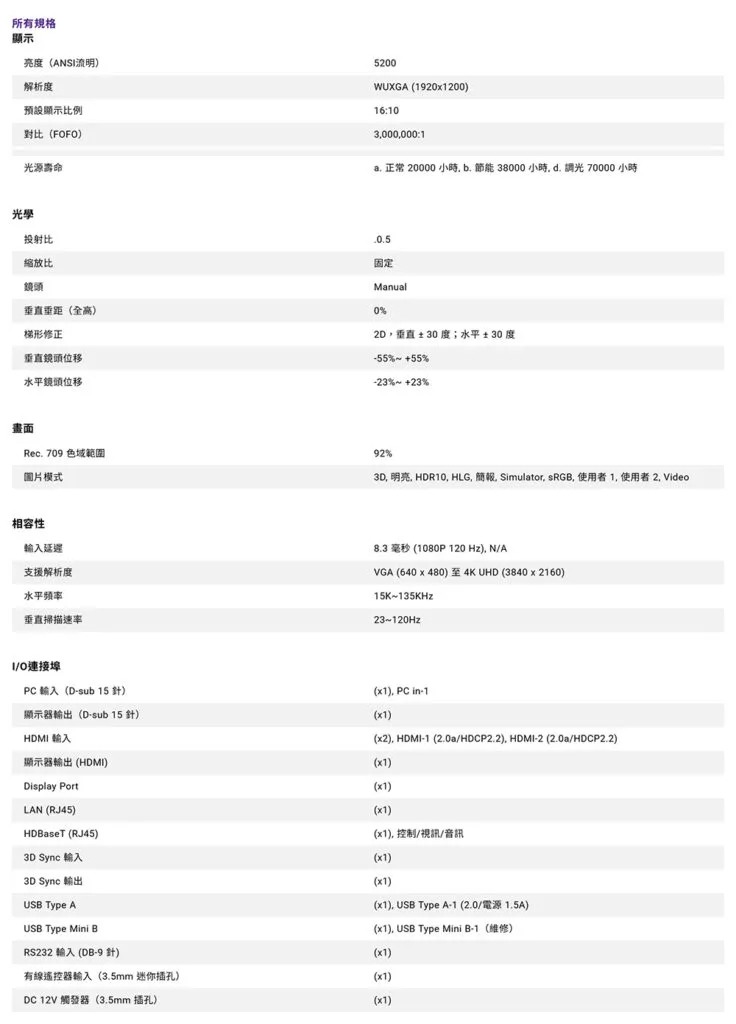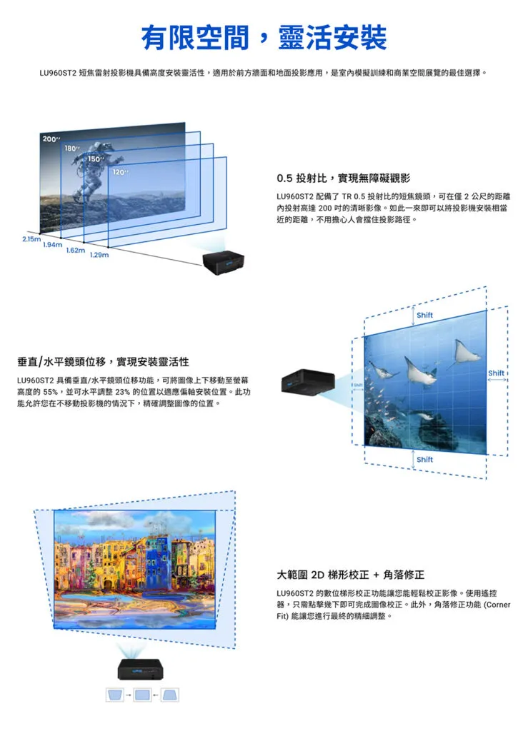 - 靈活安裝:0.5 短焦投射比和大幅度鏡頭位移功能。