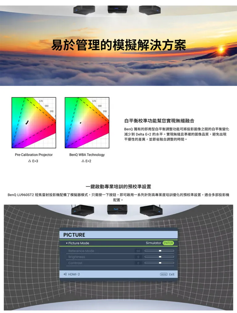 - 精準白平衡調整:可將多台投影機的畫面色彩調整一致。