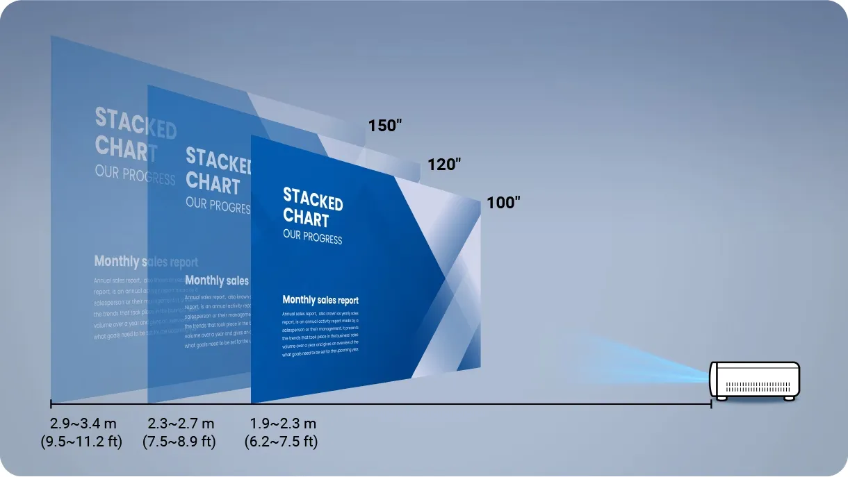 透過 1.2 倍變焦,可以在距離 2 米到 3 米範圍內投射大於 100 吋影像,在各種大小的房間都能輕鬆觀看大螢幕。