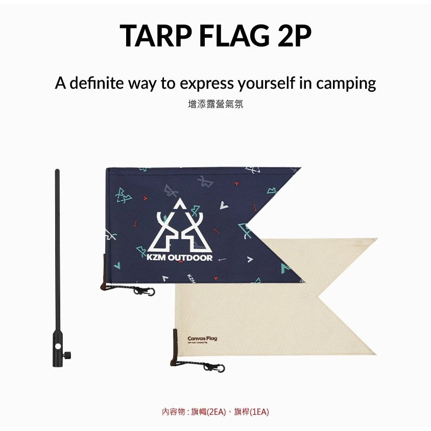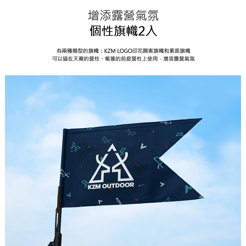 🎏有兩種類型的旗幟:KZMLOGO印花圖案旗和素面旗幟,可以插在天幕的營柱、帳篷的前庭營柱上使用.增添露營氣氛