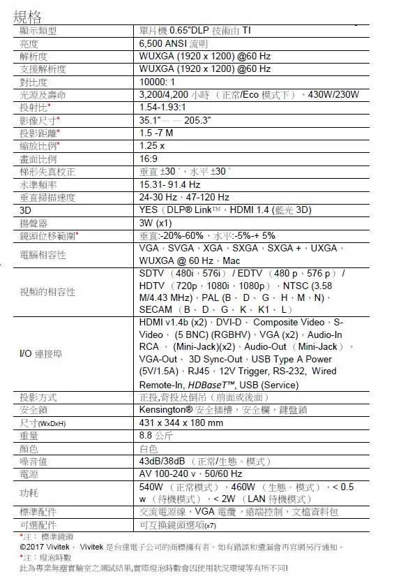 | 燈泡 | 3,200/4,200 小時 (正常/Eco 模式下) | 小時 |