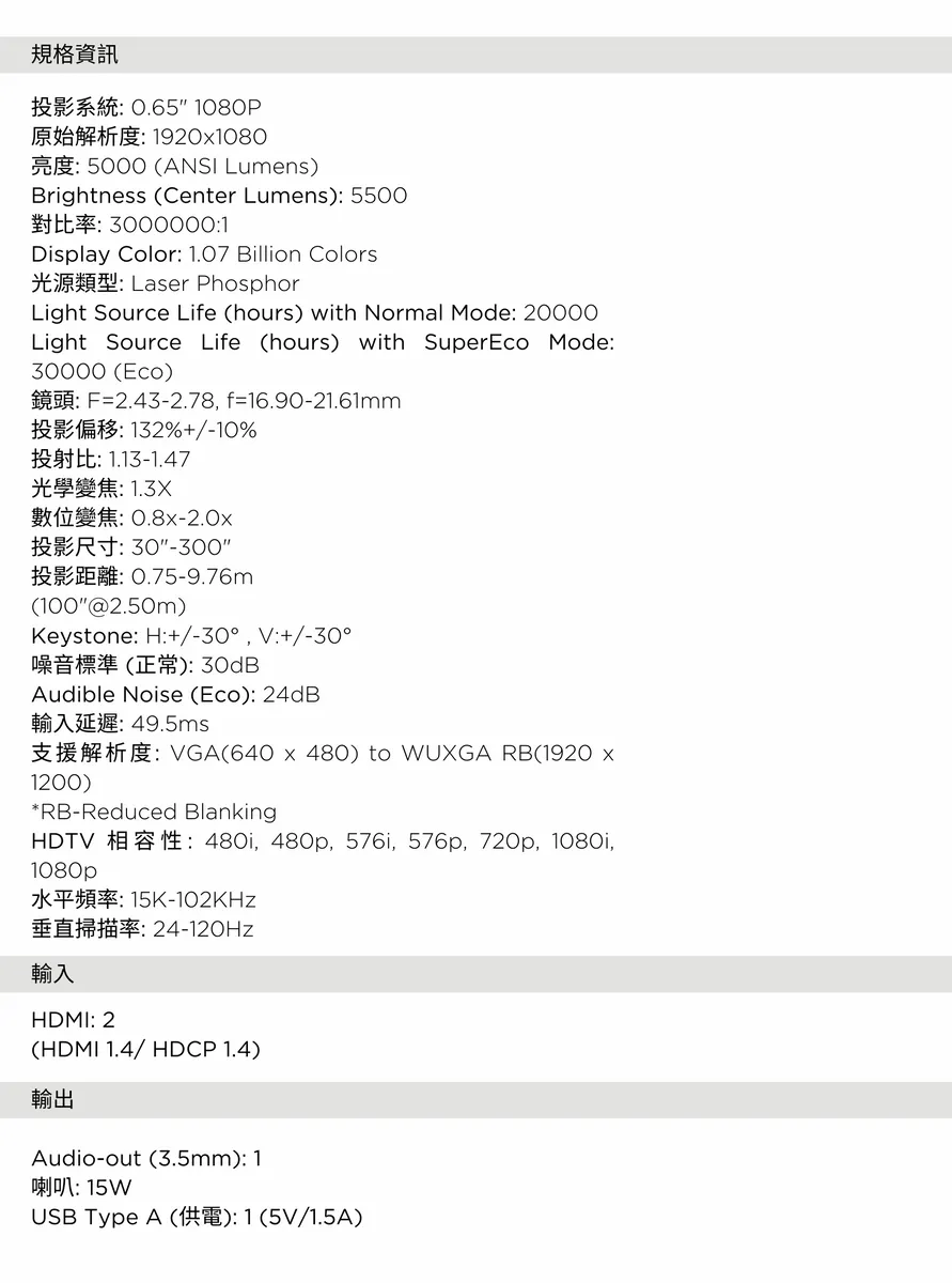 - 提供 5,000 ANSI 流明的亮度,無論在任何環境下都能呈現明亮的影像