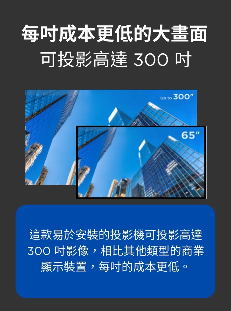 - 可投影高達 300 吋的超大畫面,每吋畫面成本更低