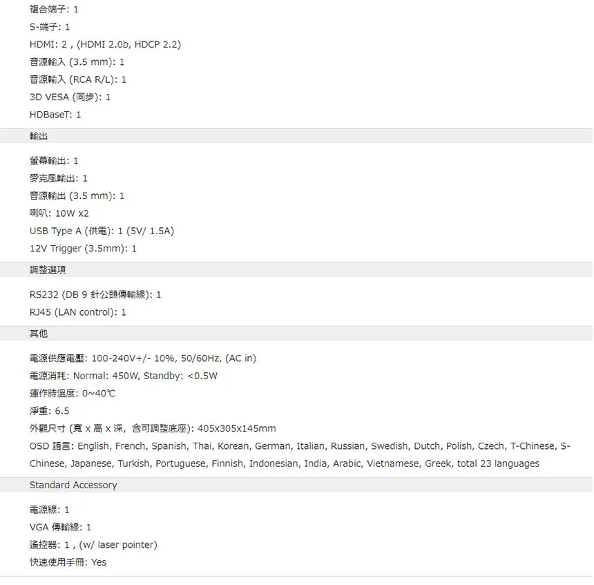 | 耗電量 | Normal: 450W, Standby: <0.5W | |