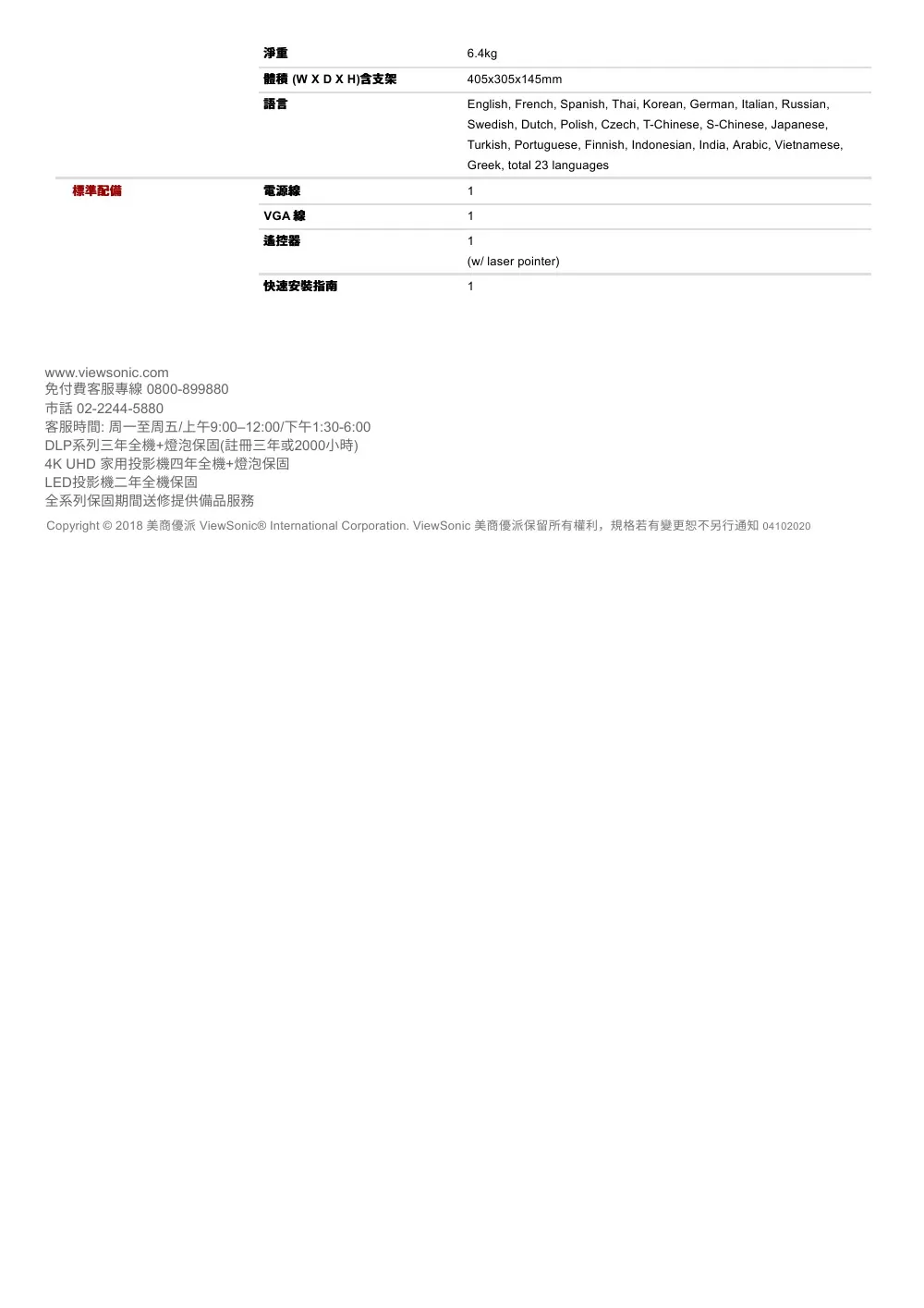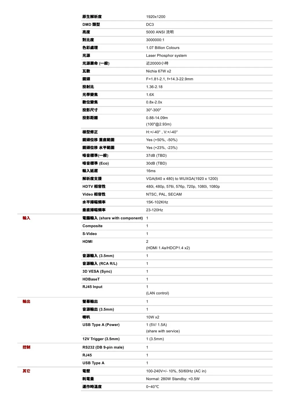 | 畫面投射距離 | 0.88-14.09m (100″@2.93m) | |