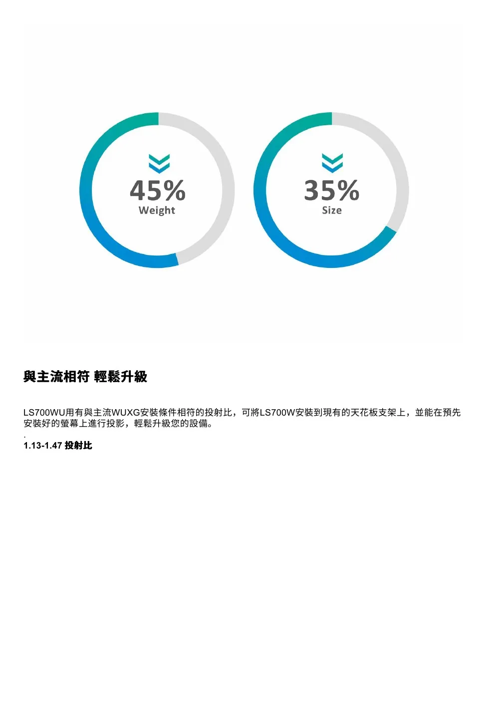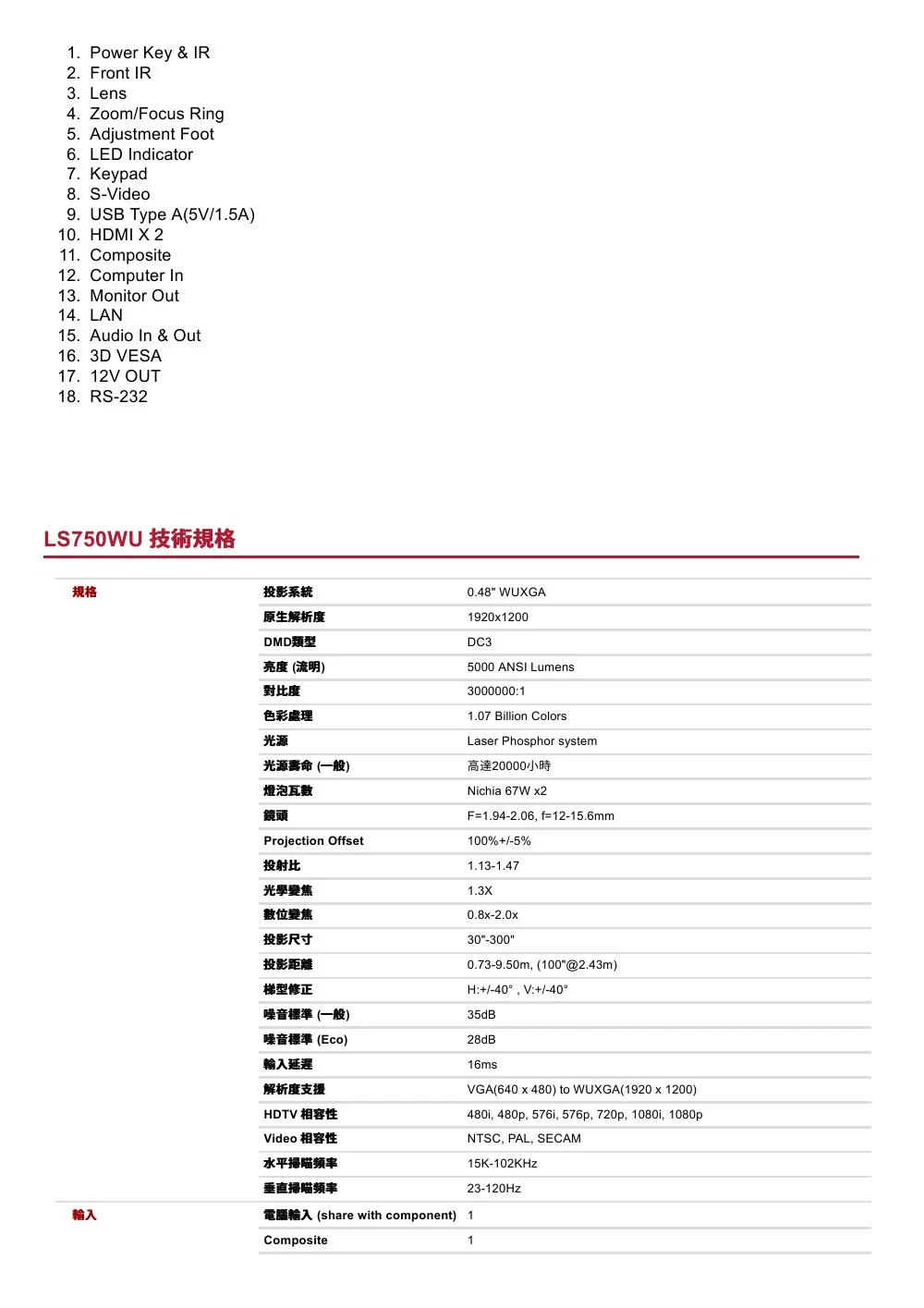 | 畫面投射距離 | 0.73-9.50m, (100″@2.43m) | |