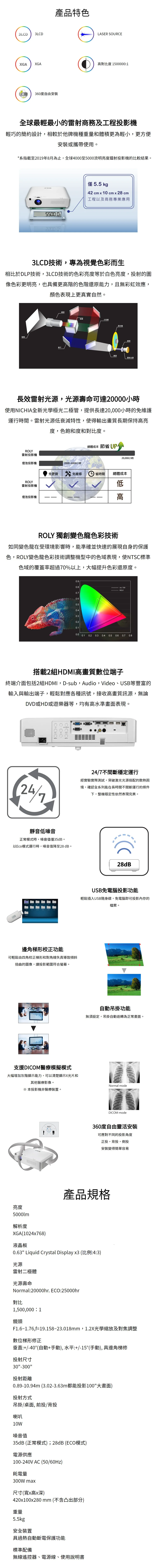 商品ROLY RL-S450W 雷射短焦投影機 WXGA ,4500流明 高亮度 -長效雷射光源,壽命長達20,000小時