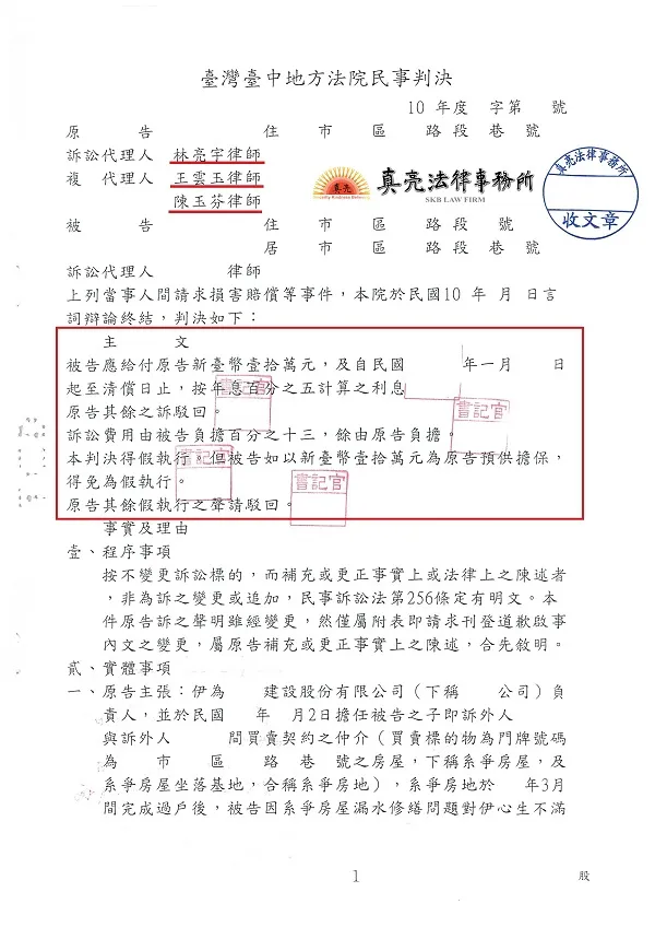 商品房屋出售後遭遇漏水,買方要求賠償,協議不成竟提出訴訟,經委任真亮法律事務所,爭取【合理】金額,判決【確定】。