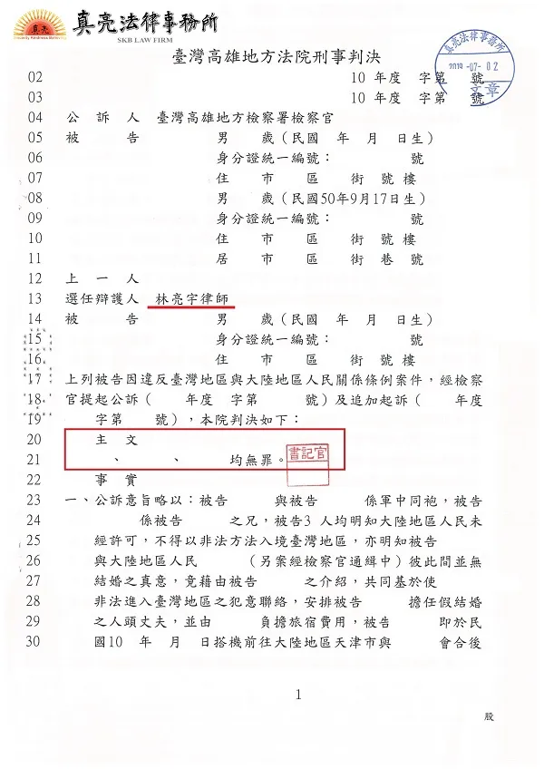 臺灣高雄地方法院開庭時,林亮宇律師成功說服法官,合議庭法官也認為本件確實沒有任何事證可證明當事人涉嫌《假結婚》,經臺灣高雄地方法院判決當事人均無罪。高雄地檢署也沒有再上訴,全案即告【無罪確定】。
