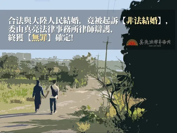 「合法與大陸人民結婚,竟被起訴【非法結婚】,委由真亮法律事務所律師辯護,終獲【無罪】確定!」由真亮法律事務所製作,以創用CC 姓名標示-非商業性-相同方式分享 4.0 國際 授權條款釋出。