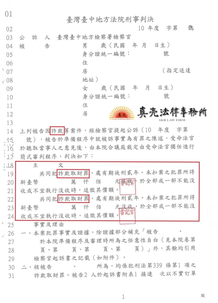 「偽造訂單詐騙他人金錢,經被害人委託真亮法律 事務所提告,遭判決【有罪】確定!」由真亮法律事務所製作,以創用CC 姓名標示-非商業性-相同方式分享 4.0 國際 授權條款釋出。