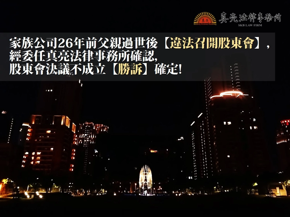「家族公司26年前父親過世後違法召開股東會,經委任真亮法律事務所確認股東會決議不成立【勝訴 】確定!」由真亮法律事務所製作,以創用CC 姓名標示-非商業性-相同方式分享 4.0 國際 授權條款釋出。