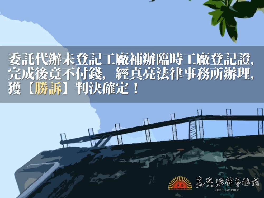 「委託代辦未登記工廠補辦臨時工廠登記證,完成工作後竟不付錢,經真亮法律事務所辦理,獲【勝訴】判決確定!」由真亮法律事務所製作,以創用CC 姓名標示-非商業性-相同方式分享 4.0 國際 授權條款釋出。