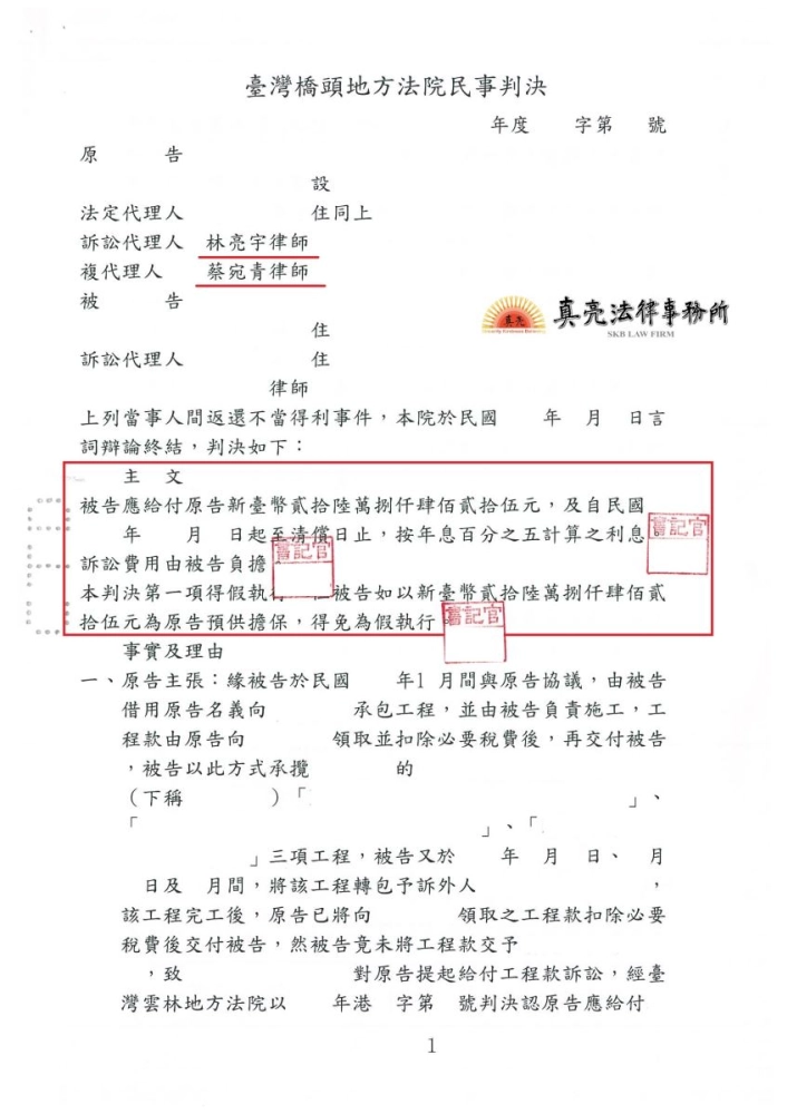 「受託代為執行工程,收取報酬後竟然不給付給分包商,經真亮法律事務所辦理,委託人獲【勝訴】判決確定!」由真亮法律事務所製作,以創用CC 姓名標示-非商業性-相同方式分享 4.0 國際 授權條款釋出。