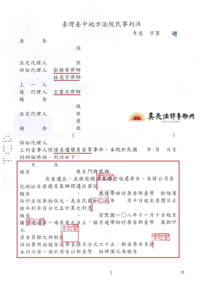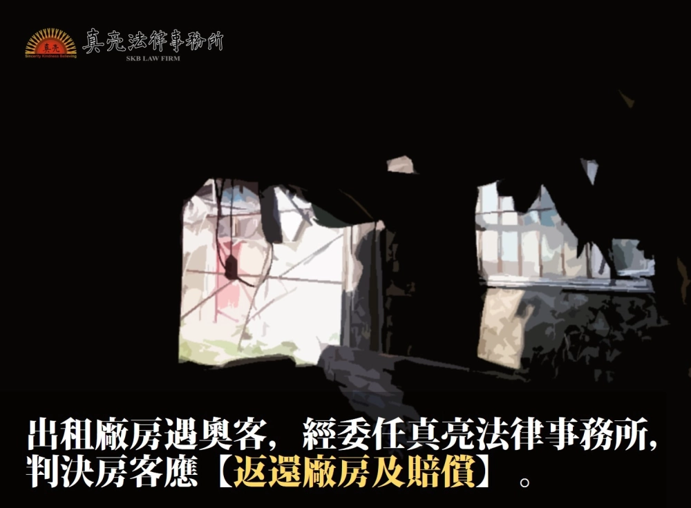 「出租廠房遇奧客,經委任真亮法律事務所,判決房客應返還廠房及賠償。」由真亮法律事務所製作,以創用CC 姓名標示-非商業性-相同方式分享 4.0 國際 授權條款釋出。