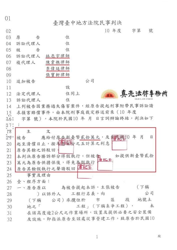 「員工於工地不慎受傷,要求天價賠償,經雇主委任真亮法律事務所,協助雇主僅需【合理】賠償!」由真亮法律事務所製作,以創用CC 姓名標示-非商業性-相同方式分享 4.0 國際 授權條款釋出。