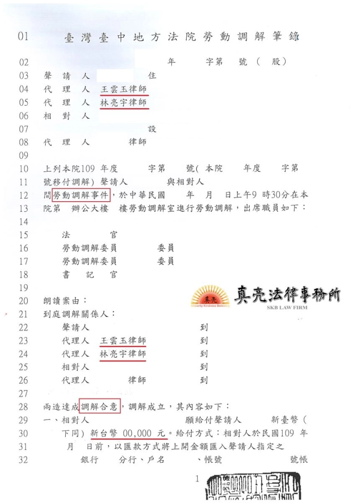 經過法官及調解委員的勸喻,員工當然知道回去工作一定會被刁難,在林亮宇律師提供協助之下,成功爭取,要求老闆限期給付數個月的薪水,作為和解條件,並且必須要開立非自願離職證明,以保障員工之權益。