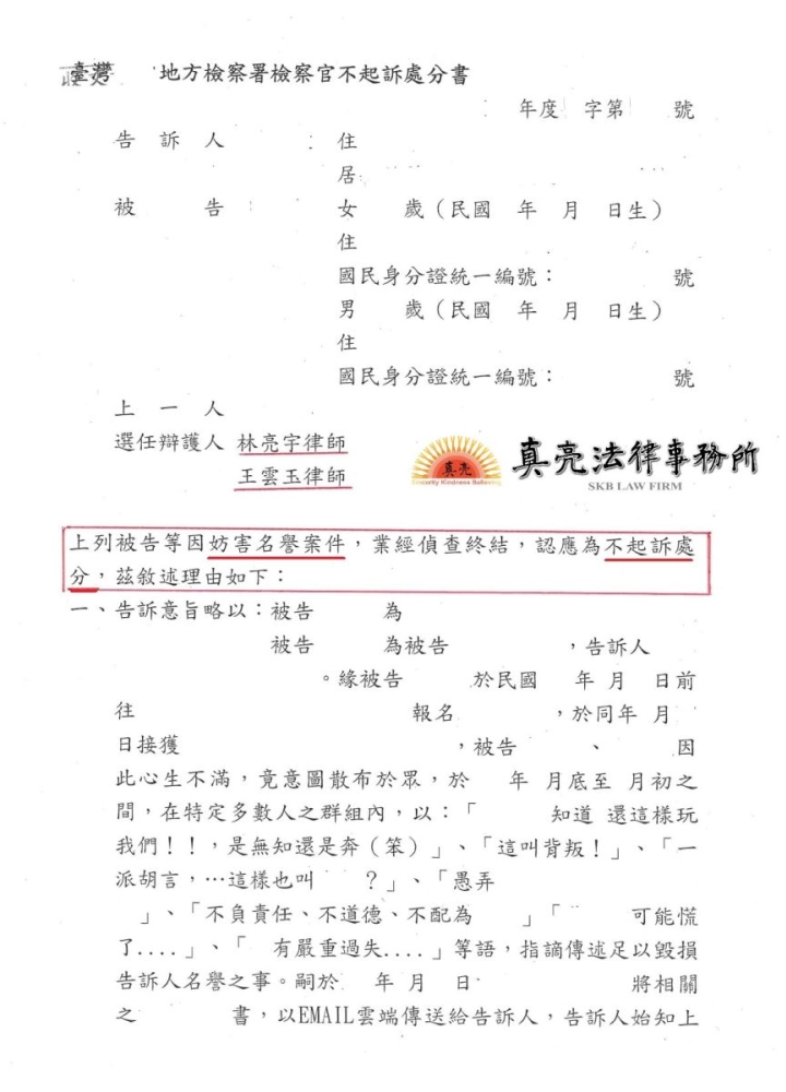 開庭時成功說服檢察官,檢察官也認為本件確實沒有任何事證可證明當事人涉嫌【妨害名譽】、【誹謗】之情形,後續由地檢署作成【不起訴】處分確定。