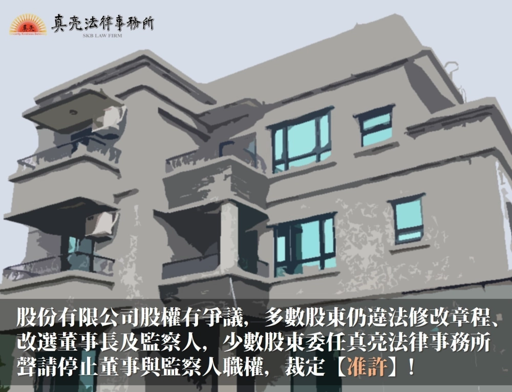「股份有限公司股權有爭議,多數股東仍違法修改章程、改選董事長及監察人,少數股東委任真亮法律事務所聲請停止董事與監察人職權,裁定【准許】!」由真亮法律事務所製作,以創用CC 姓名標示-非商業性-相同方式分享 4.0 國際 授權條款釋出。