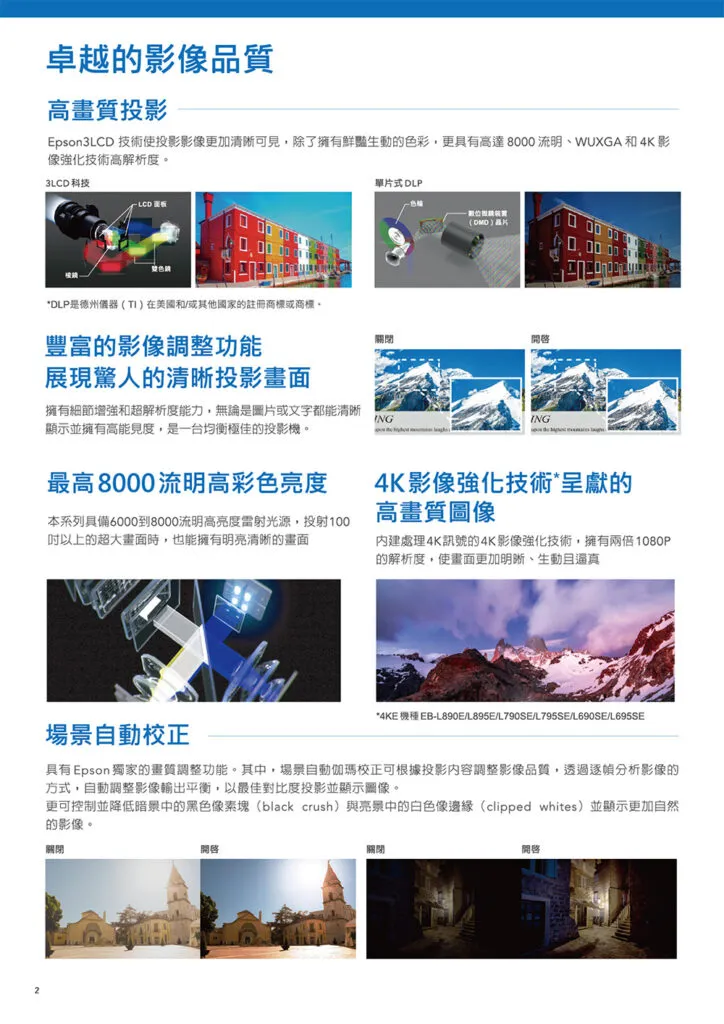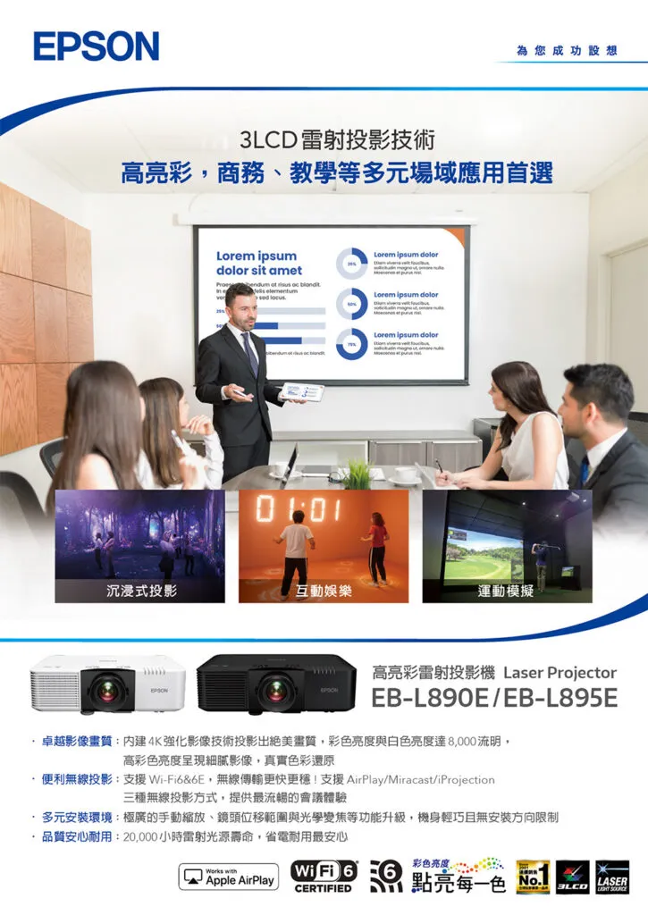 EB-L895E可處理 4K 訊號,內建4K強化影像技術使投影畫面解析度達雙倍1080P的超高畫質,以 3LCD 投影技術造就8,000流明白色亮度與彩色亮度,提供身臨其境的逼真影像。高亮度投影不需關閉環境光源,即可輕鬆擁有高畫質。