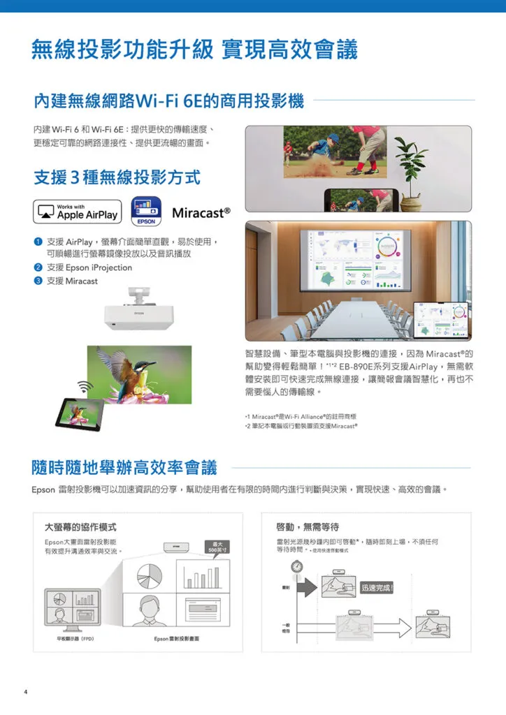 - 完善無線投影: 支援Wifi6&6E,無線傳輸更快更穩,支援Airplay/Miracast/iProjection三種投影方式,提供最流暢的會議體驗