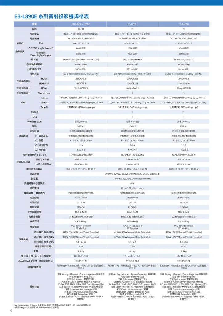 - 卓越影像畫質: 彩色亮度與白色亮度達8,000流明,內建4K強化影像技術與超過5,000,000:1的高對比度,Epson 3LCD技術投影出絕美畫質