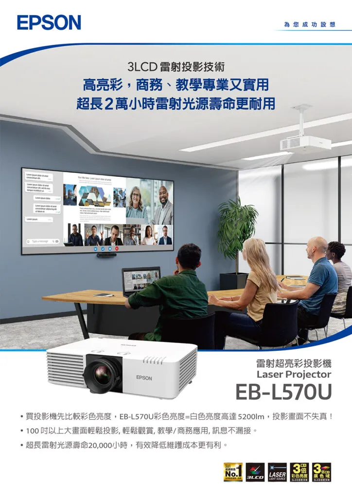 新世代商務會議雷射光源投影解決方案。高彩色亮度呈現細膩影像,真實色彩還原。