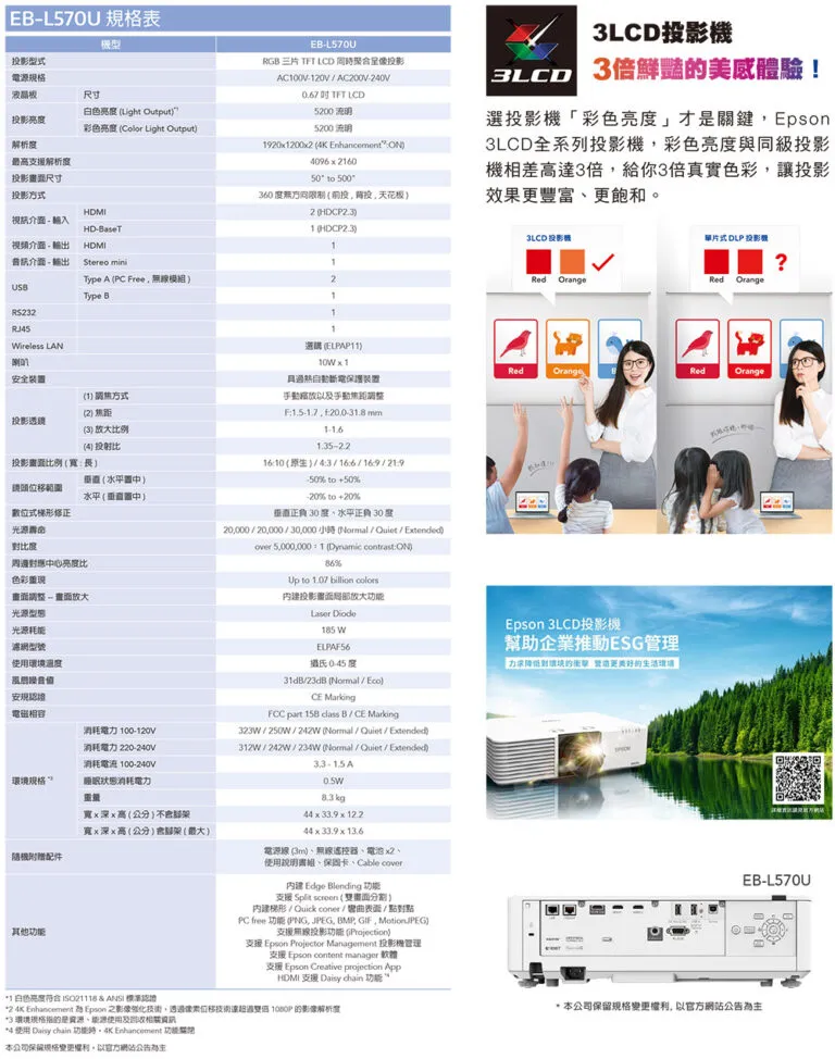 - 高畫質影像: 內建4K強化影像技術與超過2,500,000:1的高對比度,彩色亮度與白色亮度高達5,200流明,Epson 3LCD技術投影出絕美畫質