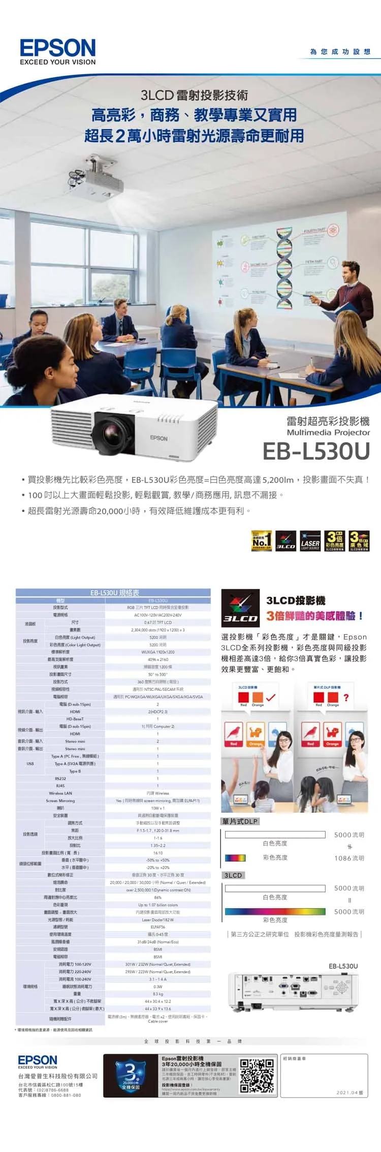 所有Epson投影機皆採用3LCD技術,相較於單片式DLP®投影機,具有更顯著的優勢。EB-L530U彩色亮度=白色亮度5200lm,最大3倍彩色亮度且無彩虹效應,具有更優異的色彩飽和度與明亮度。