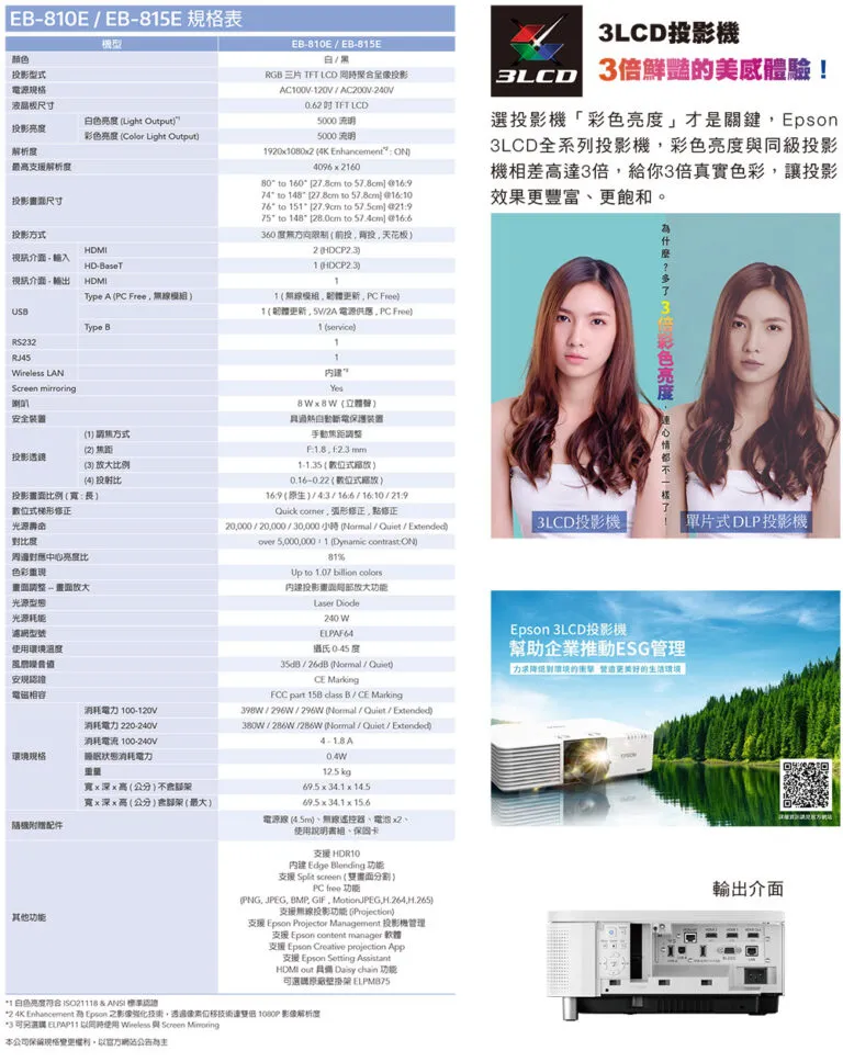 EB-810E系列可處理 4K 訊號,內建 4K 強化影像技術,使投影畫面解析度達雙倍1080P的超高畫質,以 3LCD 投影技術造就5,000流明白色亮度與彩色亮度,提供身臨其境的逼真影像。高亮度投影不需關閉環境光源,即可輕鬆擁有高畫質。