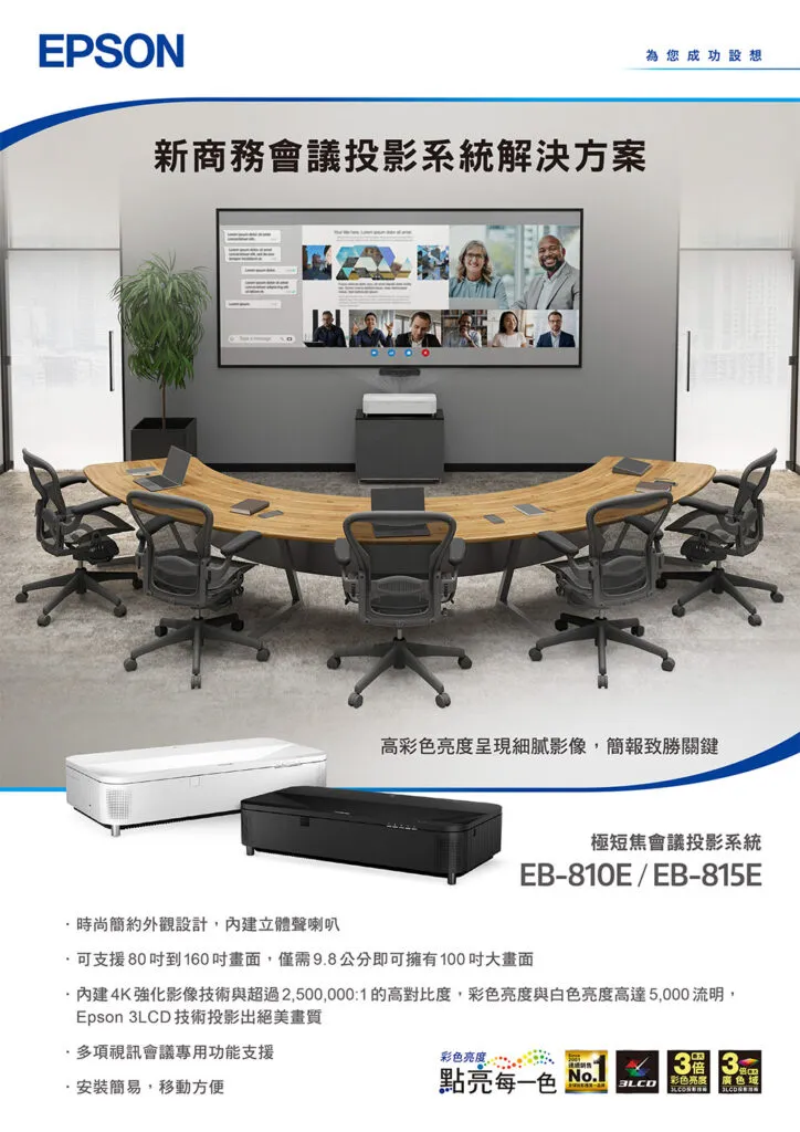 EB-810E為Epson最新極短焦會議投影系統,採用時尚、簡約的設計,且內建兩個具人聲模式的立體聲喇叭。非常適合架設在各種環境,包括現代化的辦公室,混合型視訊會議室及中小型會議室等室內空間。
