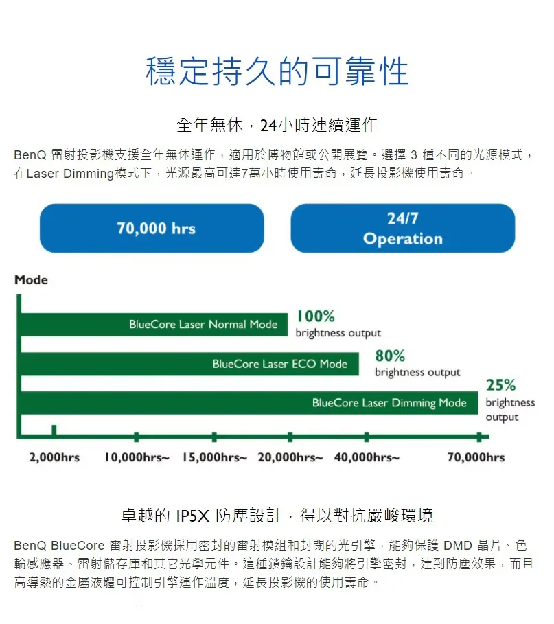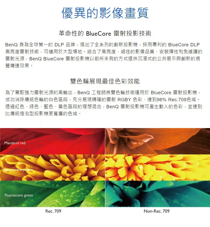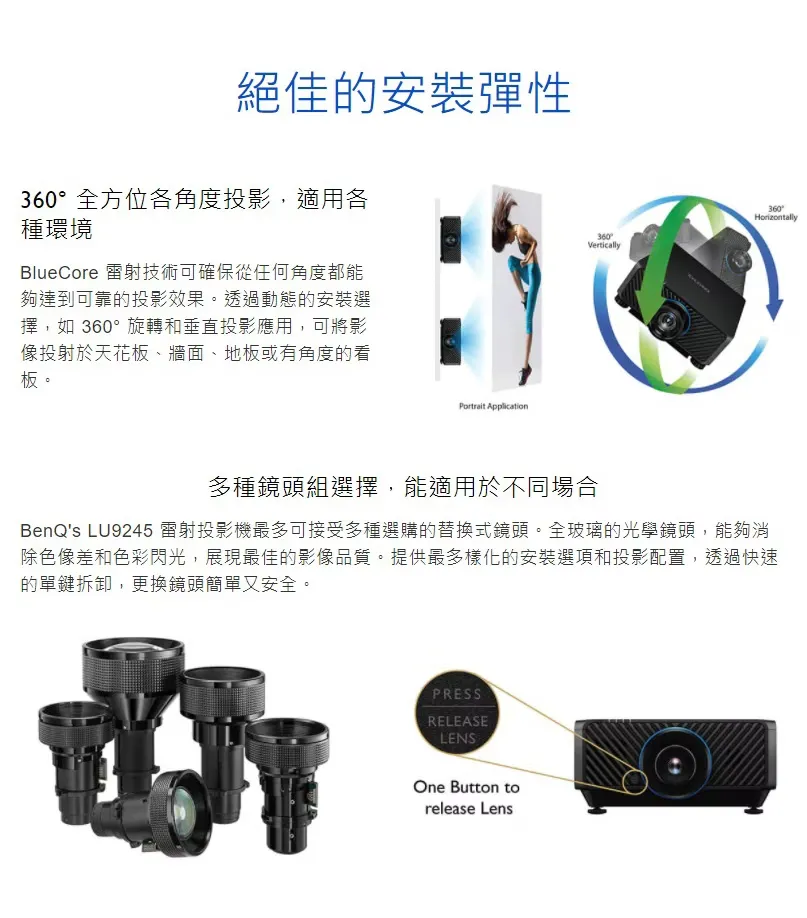 - BlueCore 雷射引擎也可透過雙色輪系統展現絕佳的色彩效能,並支援 360° 和直向安裝,而且耐用度大幅提升,針對各種不同應用可支援全天候不斷運作。