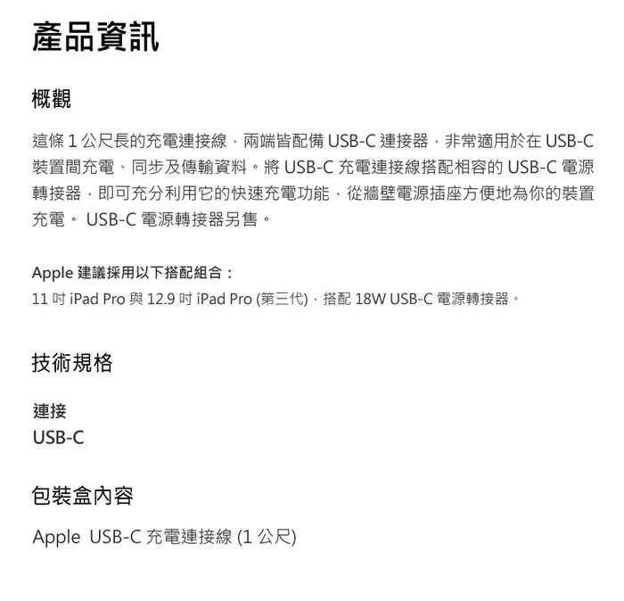 • Apple Type C對Type C 1M原廠傳輸線(盒)