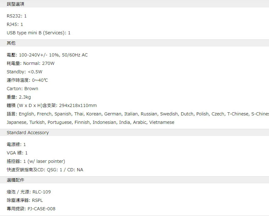| 燈泡 | (一般/節能) : 5000/15000 | 小時 |