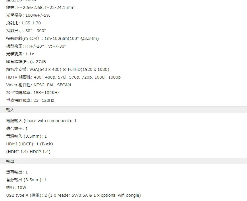 | 畫面投射距離 | 1m-10.98m(100″ @3.34m) | |