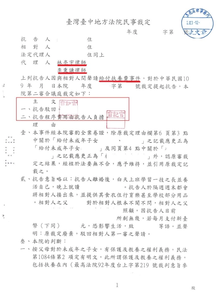 真亮法律事務所近期承辦一件案件,夫妻離婚,育有一子,雙方離婚時協議由父親扶養,但母親卻不願意給付扶養之費用。當事人求助真亮法律事務所所長林亮宇律師,林亮宇律師評估雙方原先之協議,建議應依照當地消費支出要求對方給付。第一審法院法官經過調查後,確認母親確實有義務扶養,惟考量雙方情形而訂出扶養費數額,豈料,對方仍不用意給付,抗告到二審,第二審法官認為原審之判斷妥當,駁回母親之抗告【確定】。