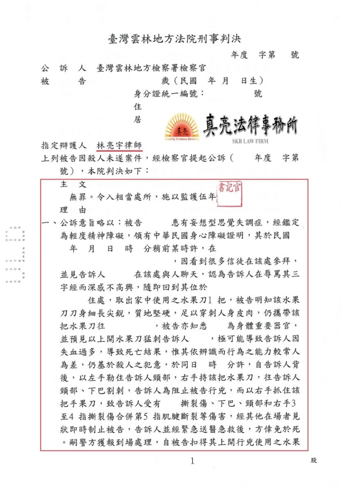 真亮法律事務所近期承辦一件案件,為法院指定之辯護案件,當事人罹患精神疾病十多年,因為已接受醫療多年,周邊親友就有些疏忽,某日竟然幻想鄰居在辱罵自己,一時憤怒回家拿刀,並刺了鄰居的致命部位,還好旁邊有人協助才沒發生更大悲劇。