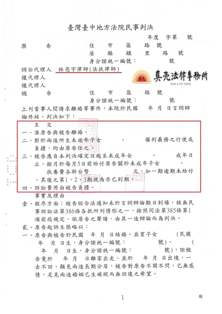 真亮法律事務所近期承辦一件案件,為法律扶助基金會派案,當事人與丈夫結婚多年,育有二名子女,丈夫在外經商以當事人為保證人借款,還不出來竟一走了之,拋家棄子,行為非常離譜。真亮法律事務所所長林亮宇律師接辦後,與所內律師研究後,向法院對丈夫提出離婚、單獨監護以及未成年子女扶養費的訴求,並仔細整理當事人提出之文件給法院審酌。法官認為該當事人提出之理由充分,就全部的主張均採納,判決當事人【勝訴】確定。