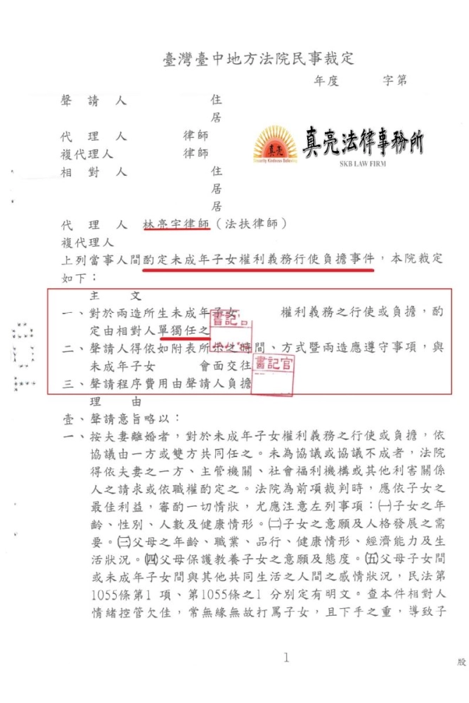 真亮法律事務所所長林亮宇律師接辦後,與所內律師研究後,認為在本案件可以強調「幼年從母原則」、「主要照顧者原則」、「繼續性維持原則」等,以強化我方的優勢,並仔細整理當事人提出之文件給法院審酌。法官認為該當事人提出之理由充分,就全部的主張均採納,判決當事人【單獨監護】確定。