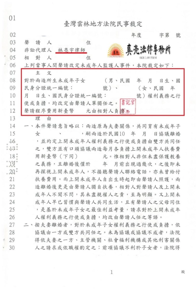 真亮法律事務所所長林亮宇律師接辦後,向法院對父親提出單獨監護的訴求,並仔細整理當事人提出之文件給法院審酌。法官認為該當事人提出之理由充分,就全部的主張均採納,判決當事人【勝訴】確定。