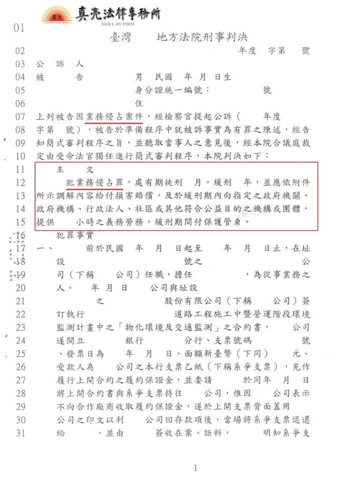 「員工侵占公司金錢拒不返還,委任真亮法律事務所提告,遭判決【有罪】確定!」由真亮法律事務所製作,以創用CC 姓名標示-非商業性-相同方式分享 4.0 國際 授權條款釋出。