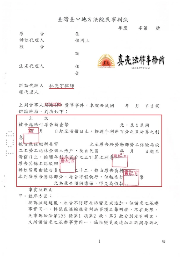 同時員工還提出請求給付工資等民事訴訟,經當事人公司求助真亮法律事務所所長林亮宇律師,經林亮宇律師與所內律師研究後認為,由公司經營過程可以判斷,當事人沒有逃避勞健保的保費,只是因為不瞭解法令規定,但是員工所提之訴求,很大的一部份並無道理,應該要仔細說明,讓法官瞭解,第一審判決及第二審判決金額,大約只採納員工原來主張的百分之20不到,也讓當事人公司的損害及額外支出降到最低。