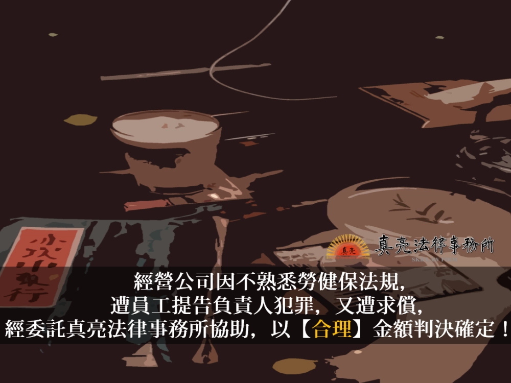 「經營公司因不熟悉勞健保法規,遭員工提告負責人犯罪,又遭求償,經委託真亮法律事務所協助,以【合理】金額判決確定!」由真亮法律事務所製作,以創用CC 姓名標示-非商業性-相同方式分享 4.0 國際 授權條款釋出。