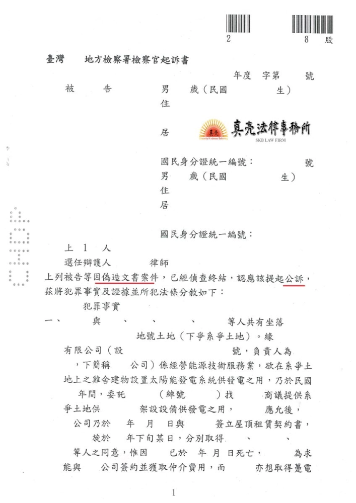 「仲介太陽能板工程,竟然提供已死亡地主之同意書,十分離譜,經被害公司委任真亮法律事務所提告,被告遭判決【有罪】確定!」由真亮法律事務所製作,以創用CC 姓名標示-非商業性-相同方式分享 4.0 國際 授權條款釋出。