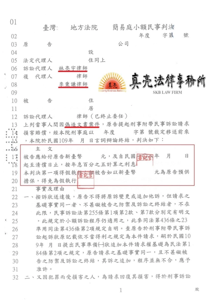 但是仲介業者竟然還是不願意返還仲介費用,經當事人公司委託真亮法律事務所所長林亮宇律師提出民事訴訟,由於證據清楚,因此地方法院也判決被告應【賠償損害金額】給當事人公司,勝訴確定。